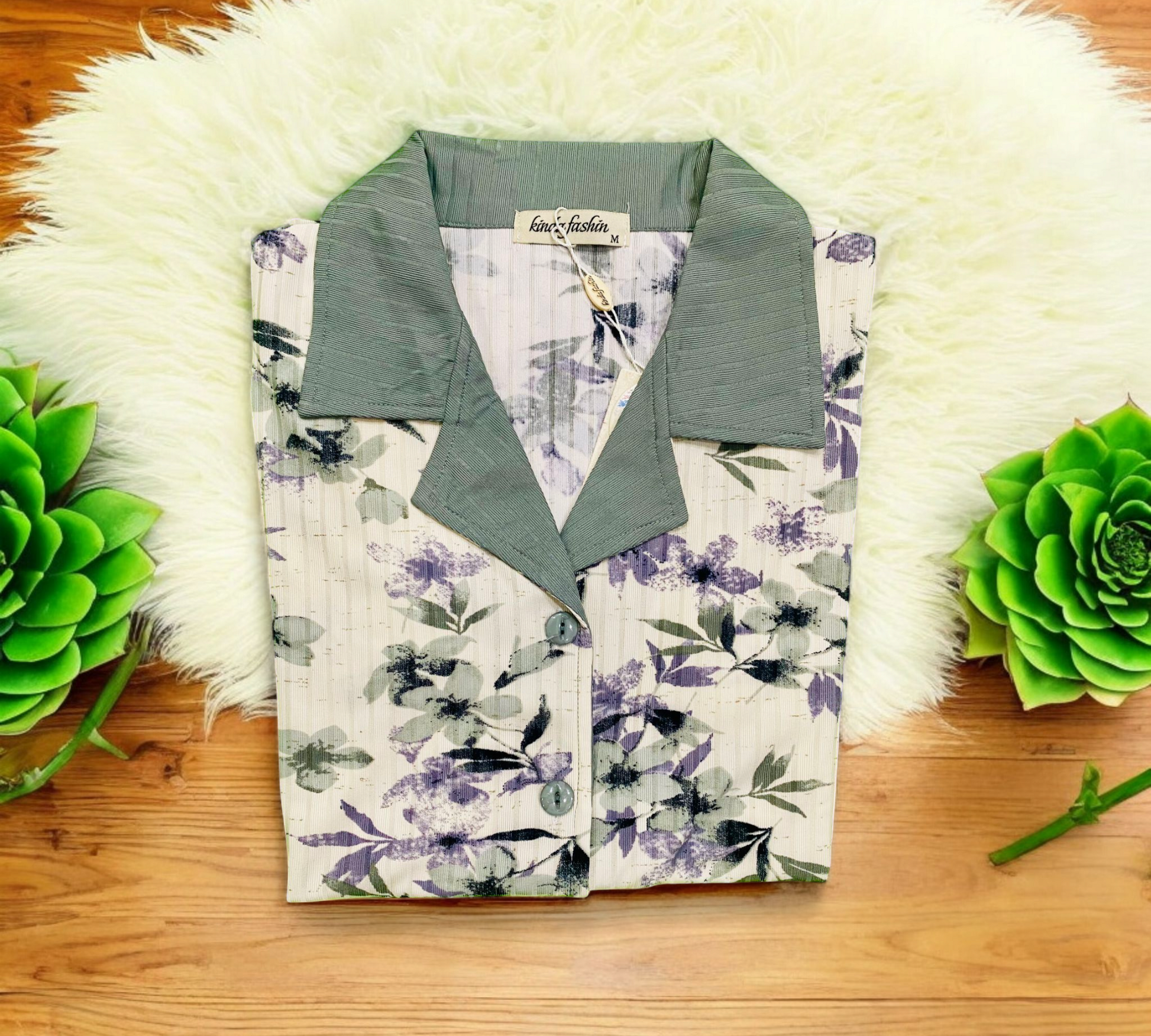 Unwind in effortless style with the Grey Blossom sleepwear set. Designed exclusively for women, this elegant two-piece features a soft floral button-down shirt with a contrast grey collar and cuffs, paired with matching grey trousers. Made from ultra-soft fabric, it's the perfect choice for peaceful sleep and stylish lounging.